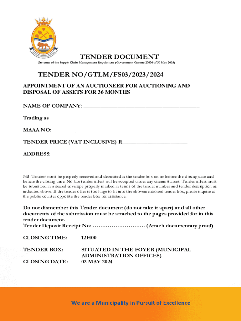 TENDER DOCUMENT(In terms of the Supply Chain Management Regulations (Government Gazette 27636 of 30 May 2005)TENDER NO/GLM/FS03/2023/2024 APPOINTMENT OF AN AUCTIONEER FOR AUCTIONING AND DISPOSAL OF