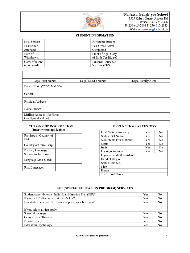 Complete the 2024-2025 Student Registration at Na Aka Gila’yew School, providing necessary student and guardianship information.