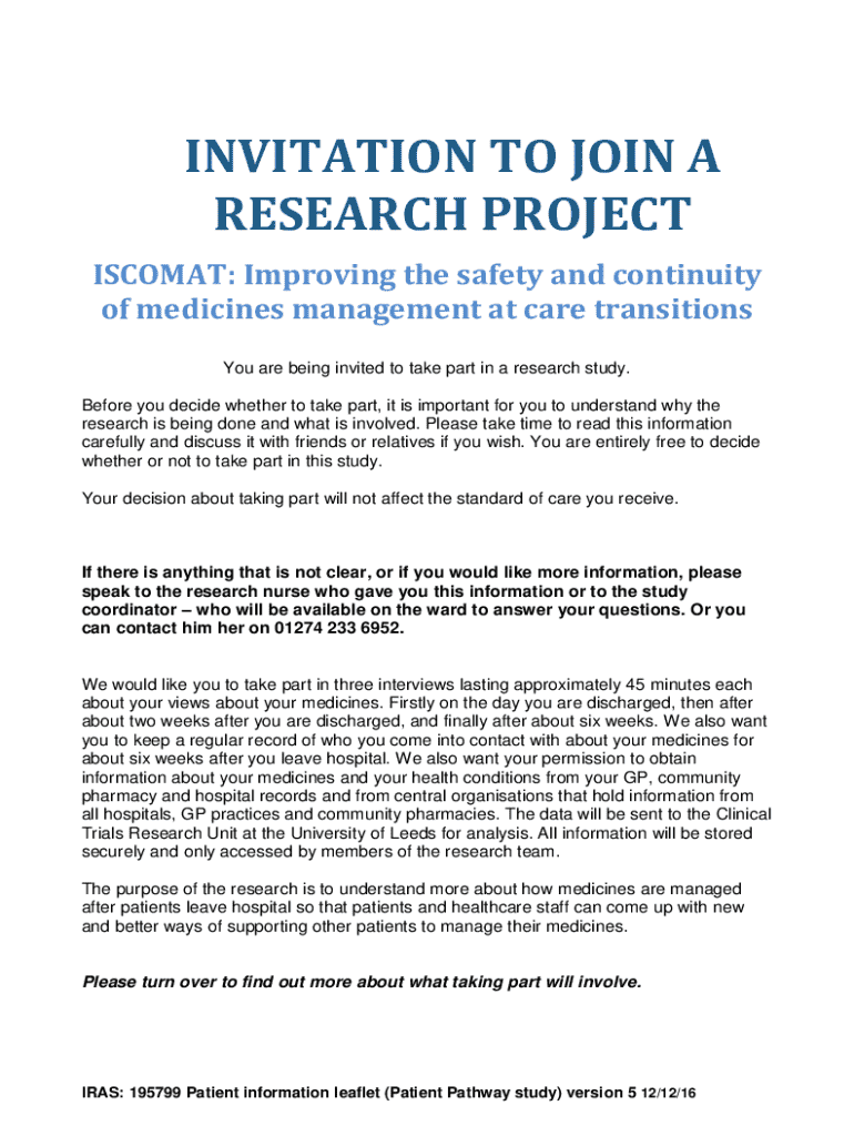 INVITATION TO JOIN A RESEARCH PROJECT INCOME: Improving the safety and continuity of medicines management at care transitions You are being invited to take part in a research study. Before you decide