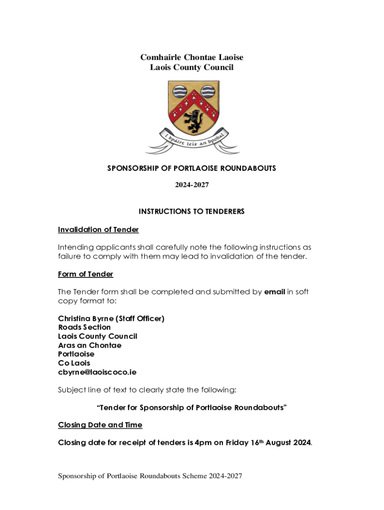Comhairle Chontae Laoise Laois County CouncilSPONSORSHIP OF PORTLAOISE ROUNDABOUTS 20242027 INSTRUCTIONS TO TENDERERS Invalidation of Tender Intending applicants shall carefully note the following