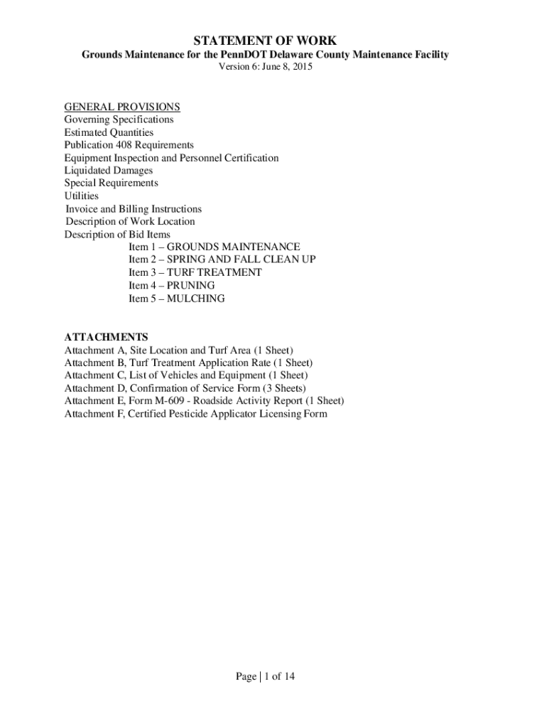 STATEMENT OF WORK Grounds Maintenance for the PennDOT Delaware County Maintenance Facility Version 6: June 8, 2015GENERAL PROVISIONS Governing Specifications Estimated Quantities Publication 408 Requirements