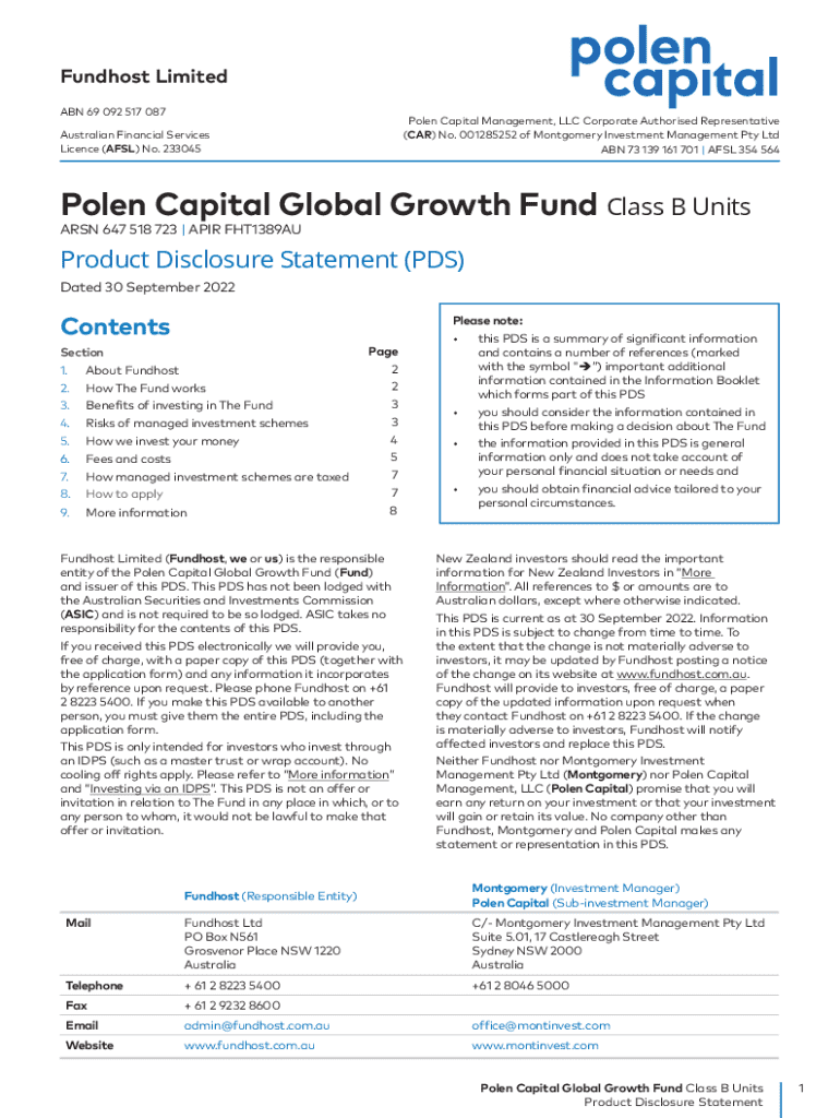 Fund host Limited ABN 69 092 517 087Polen Capital Management, LLC Corporate Authorized Representative (CAR) No. 001285252 of Montgomery Investment Management Pty Ltd ABN 73 139 161 701 | ADSL 354