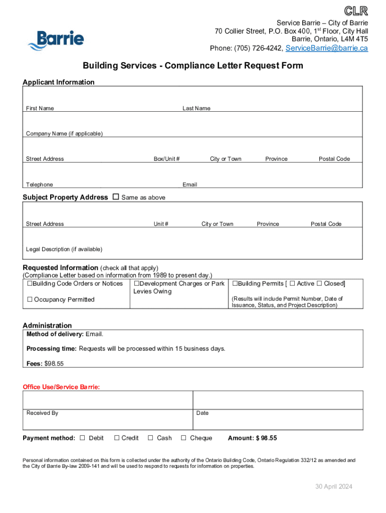 Request a compliance letter from the City of Barrie. This form includes applicant information and details on building permits and various charges.