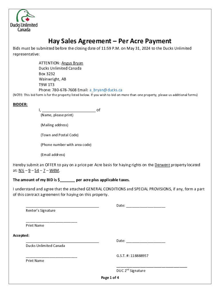 Hay Sales Agreement Per Acre Payments must be submitted before the closing date of 11:59 P.M. on May 31, 2024, to the Ducks Unlimited representative: ATTENTION: Angus Bryan Ducks Unlimited Canada