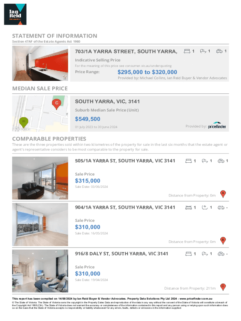 STATEMENT OF INFORMATION Section 47AF of the Estate Agents Act 1980703/1A YARRA STREET, SOUTH YARRA,111Indicative Selling Price For the meaning of this price see consumer.vic.au/underquotingPrice