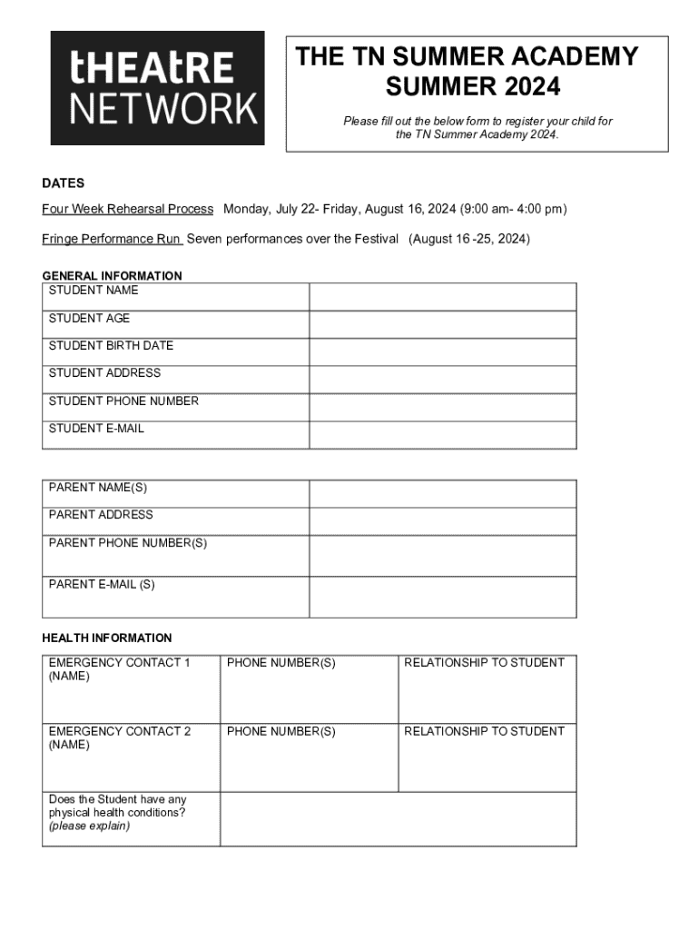 THE TN SUMMER ACADEMY SUMMER 2024 Please fill out the below form to register your child for the TN Summer Academy 2024.DATES Four Week Rehearsal Process Monday, July 22 Friday, August 16, 2024 (9:00