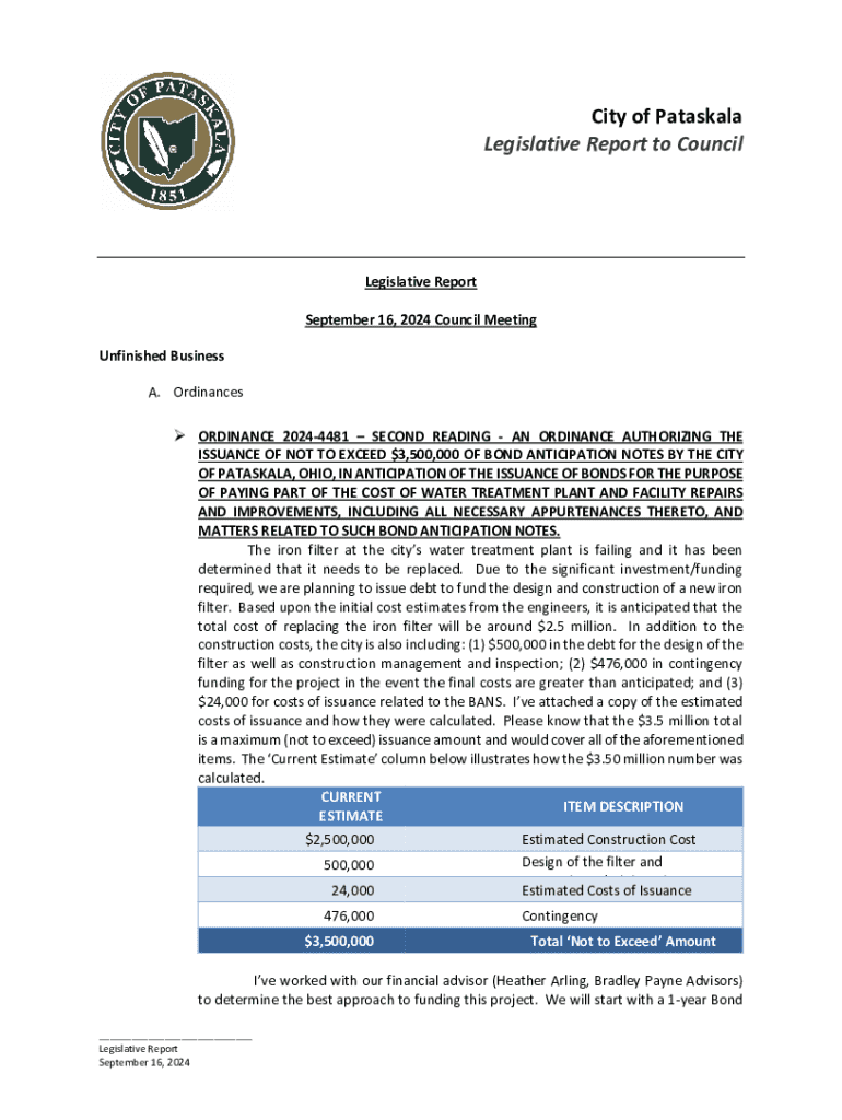 City of Pataskala Legislative Report to CouncilLegislative Report September 16, 2024 Council Meeting Unfinished Business A. Ordinances ORDINANCE 20244481 SECOND READING AN ORDINANCE AUTHORIZING THEISSUANCE