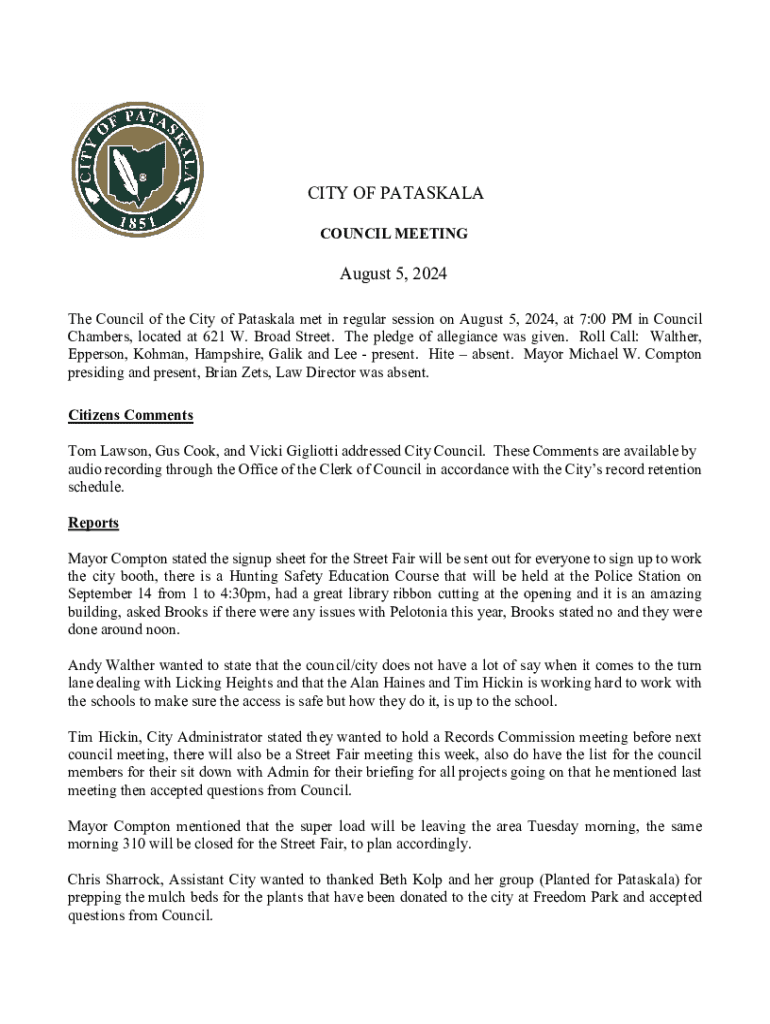 Get the free The Council of the City of Pataskala met in regular session on August 5, 2024, at 7:...