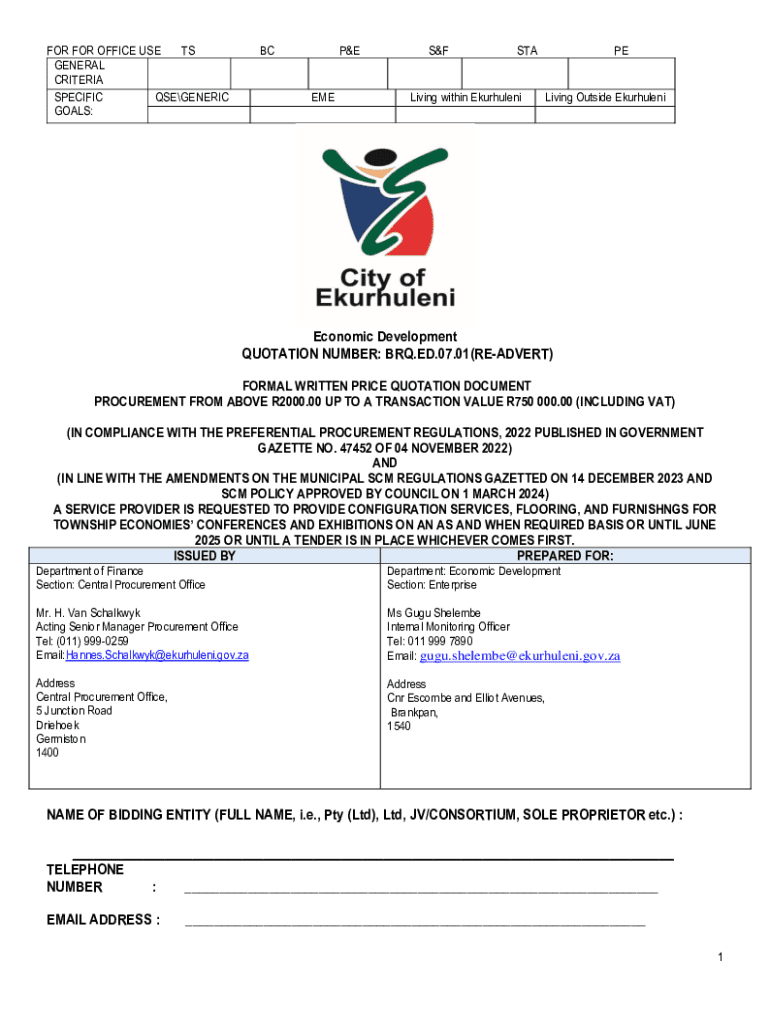 FOR OFFICE USE TS GENERAL CRITERIA SPECIFIC GENERIC GOALS:BCP&EEMES&FSTALiving within EkurhuleniPELiving Outside EkurhuleniEconomic Development QUOTATION NUMBER: BBQ.ED.07.01(READERS) FORMAL WRITTEN
