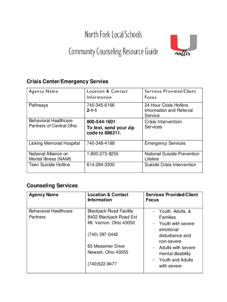 North Fork Local Schools Community Counseling Resource Guide Crisis Center/Emergency Series A gen CY Name Location & Contact Inform ationServ ices Prov died/Client FocusPathways7403456166 211Behavioral