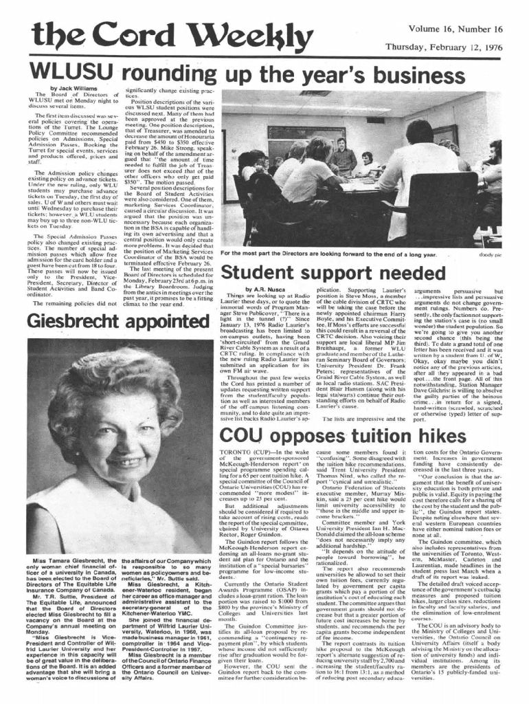 Explore the highlights from The Cord Weekly, February 12, 1976, detailing WLUSU operations, Giesbrecht\'s appointment, and upcoming events for students.