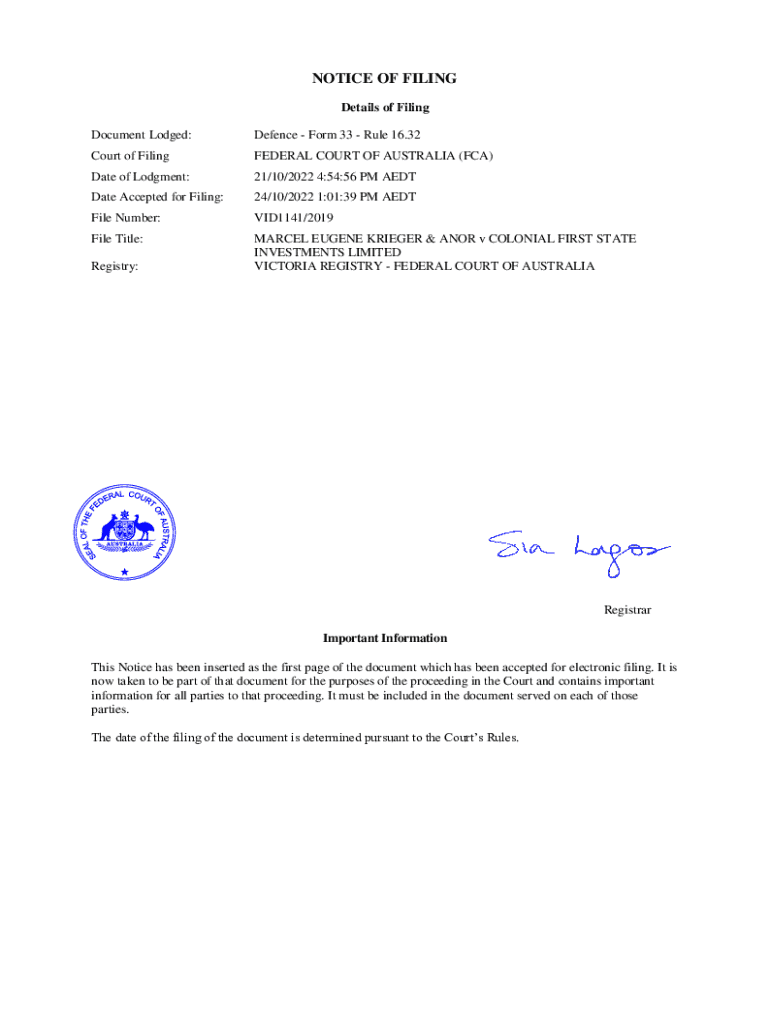 Document Lodged:Defense Form 33 Rule 16.32Court of FilingFEDERAL COURT OF AUSTRALIA (FCA)Date of Judgment:21/10/2022 4:54:56 PM Candidate Accepted for Filing:24/10/2022