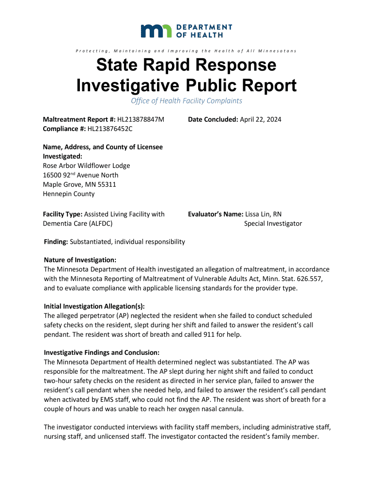 Protecting, Maintaining and Improving the Health of All MinnesotansState Rapid Response Investigative Public Report Office of Health Facility Complaints Maltreatment Report #: HL213878847M Compliance