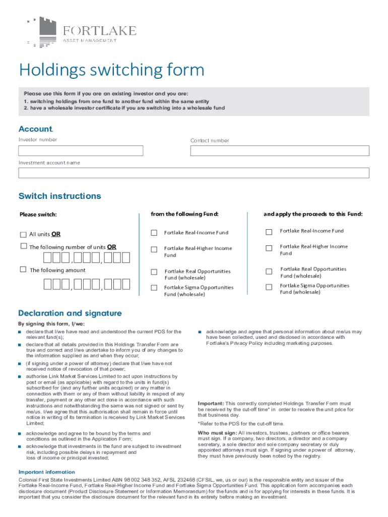 Holdings switching form Please use this form if you are an existing investor, and you are: 1. Switching holdings from one fund to another fund within the same entity 2. have a wholesale investor certificate