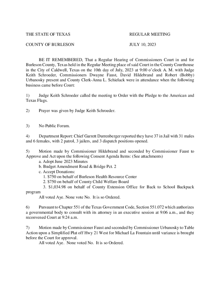 THE STATE OF TEXASREGULAR MEETINGCOUNTY OF BURLESONJULY 10, 2023BE IT REMEMBERED, That a Regular Hearing of Commissioners Court in and for Burleson County, Texas held in the Regular Meeting place