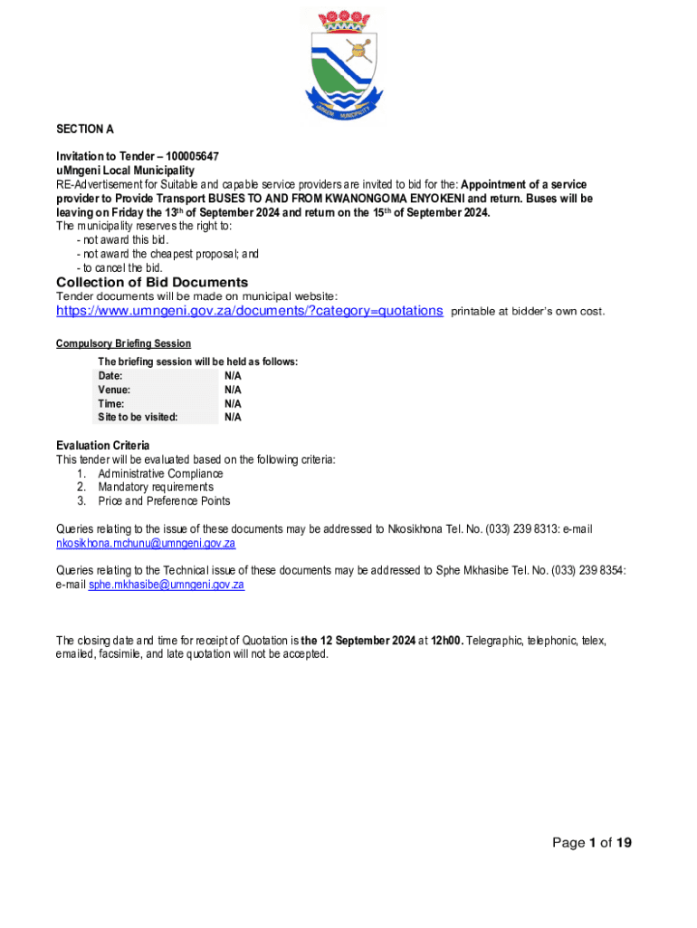 Submit bids for the transport of buses to Kwanongoma from 13th to 15th September 2024. Comply with tender terms & conditions for eligibility.