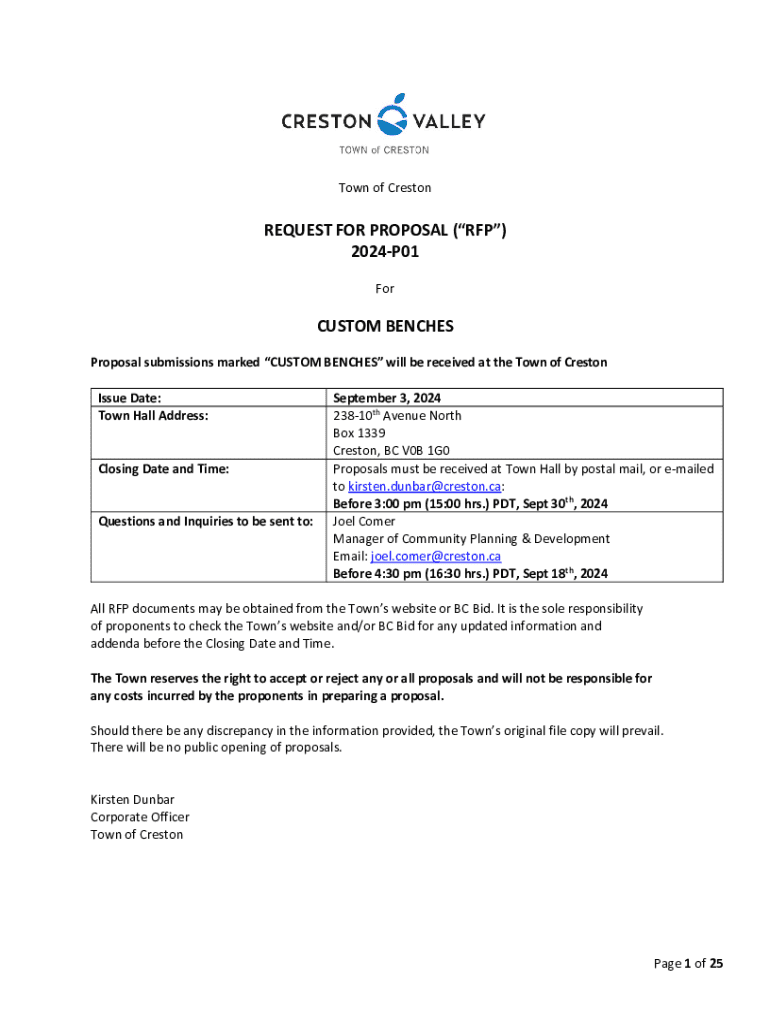 Town of CrestonREQUEST FOR PROPOSAL (RFP) 2024P01 Custom BENCHES Proposal submissions marked CUSTOM BENCHES will be received at the Town of Preston Issue Date: Town Hall Address: Closing Date and