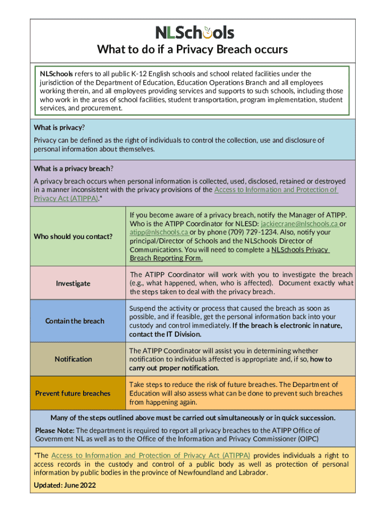 What to do if a Privacy Breach occurs NLSchools refers to all public K12 English schools and school related facilities under the jurisdiction of the Department of Education, Education Operations Branch