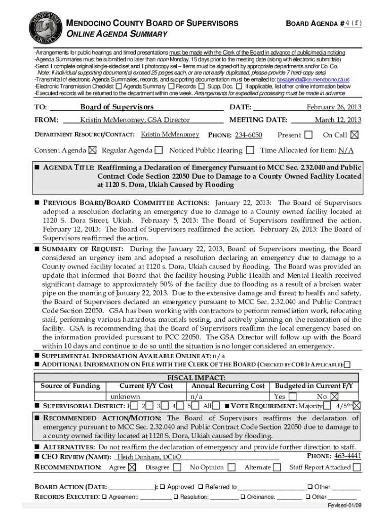 Get the free Online BOARD AGENDA #4(i) - Mendocino County Fax ...