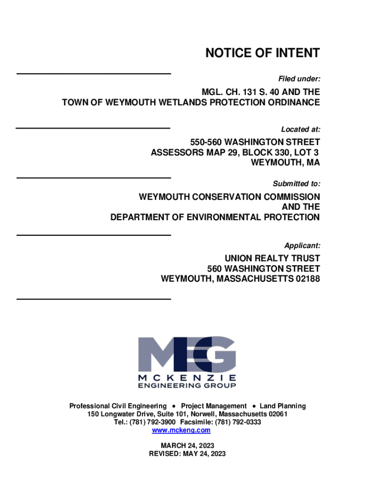 NOTICE OF INTENT Filed under:MEL. CH. 131 S. 40 AND THE TOWN OF WEYMOUTH WETLANDS PROTECTION ORDINANCE Located at:550560 WASHINGTON STREET ASSESSORS MAP 29, BLOCK 330, LOT 3 WEYMOUTH, MA Submitted