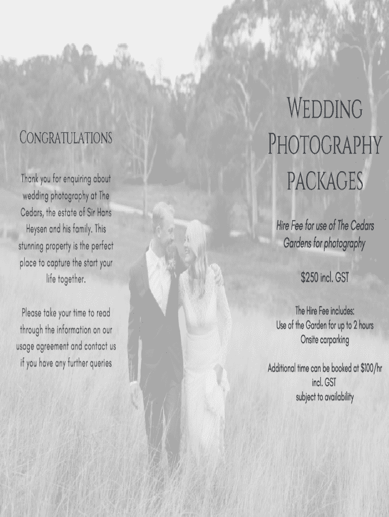 Explore wedding photography packages at The Cedars, including venue hire fees, terms, and conditions. Capture your special day in this stunning garden.