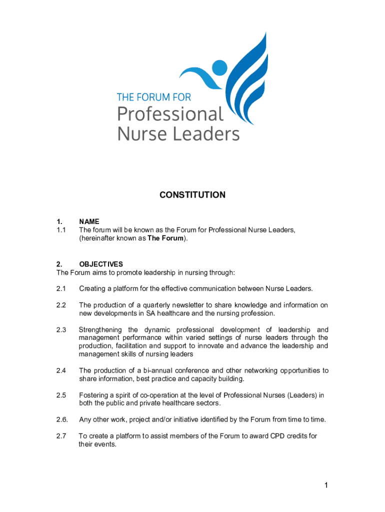 Explore the Constitution of the Forum for Professional Nurse Leaders, outlining objectives, membership, governance, and leadership in SA nursing. Join today!
