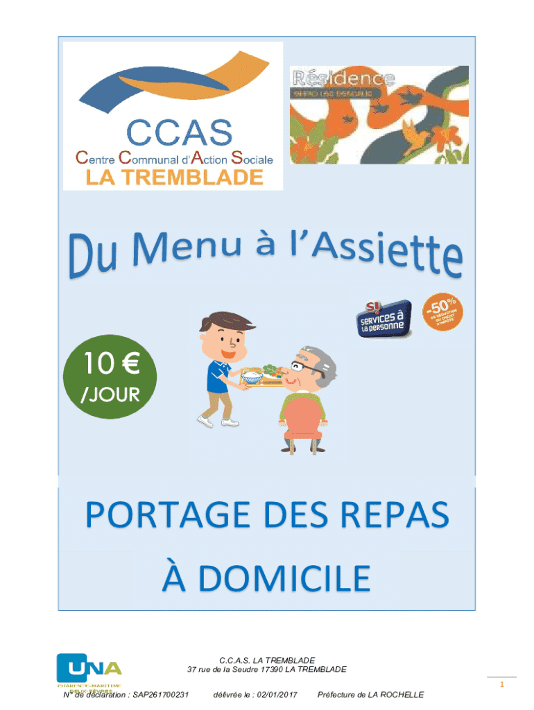 PORTAGE DES REPAS DOMICILE C.C.A.S. LA TREMBLADE 37 rue de la Seudre 17390 LA TREMBLADE1 N de dclaration : SAP261700231dlivre le : 02/01/2017Prfecture de LA ROCHELLELe Centre Communal dAction Sociale