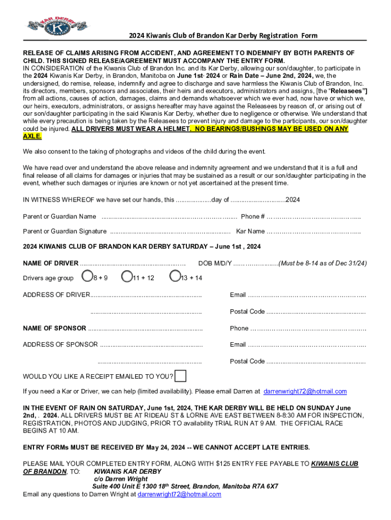 Register your child for the 2024 Kiwanis Kar Derby in Brandon. Join us on June 1st for excitement and fun. Complete the entry form by May 24, 2024.