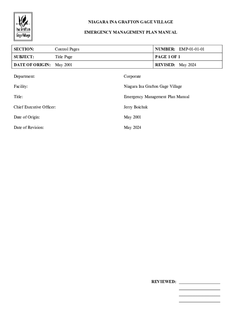 NIAGARA INA GRAFTON GAGE VILLAGE EMERGENCY MANAGEMENT PLAN MANUAL SECTION:Control PagesNUMBER: EMP010101SUBJECT:Title Average 1 OF 1DATE OF ORIGIN:May 2001REVISED: May 2024Department:CorporateFacility:Niagara