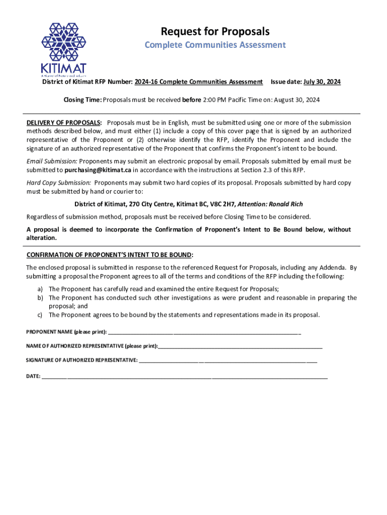Request for ProposalsComplete Communities AssessmentDistrict of Kitimat RFP Number: 202416 Complete Communities AssessmentIssue date: July 30, 2024Closing Time: Proposals must be received before 2:00