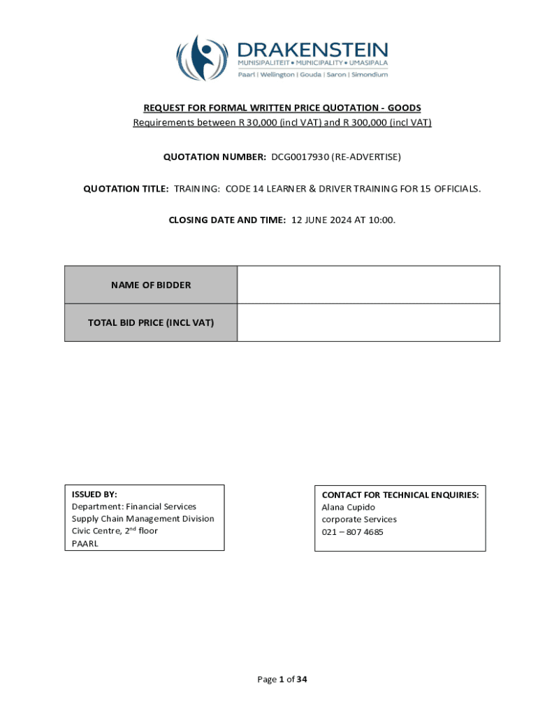 Request for quotations between R30,000 and R300,000 for training 15 officials in Code 14 learner and driver training. Closing date: June 12, 2024.