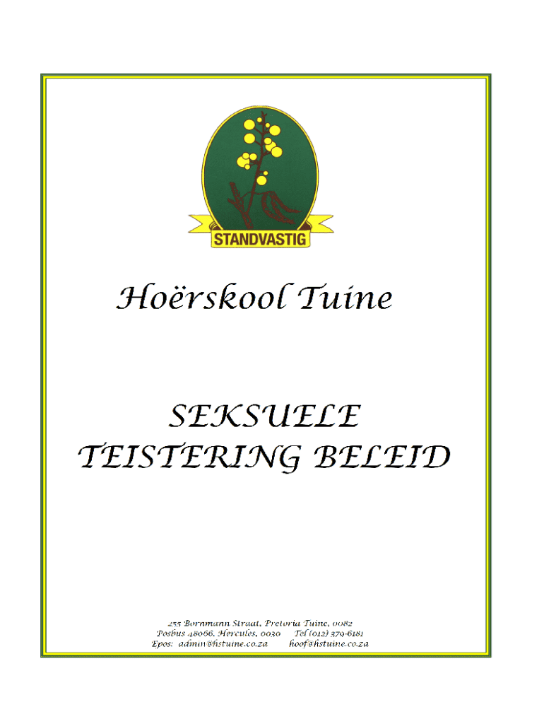 Forsook TuineSEKSUELE REGISTERING BELEID255 Bergmann Strata, Pretoria Tune, 0082 Posts 48066, Hercules, 0030 Tel (012) 3796181 EPOS: admin@hstuine.co.za hoof@hstuine.co.zaINHOUD 1. 2. 3. 4. 5. 6.