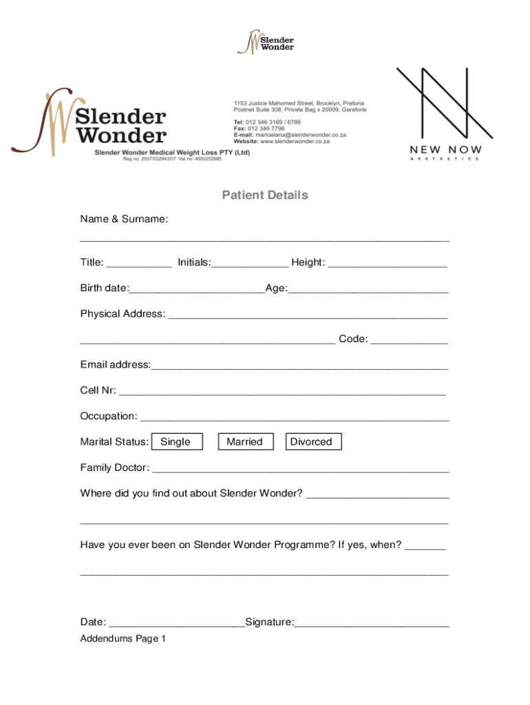 Patient Details Name & Surname: ___ Title: ___ Initials:___ Height: ___ Birth date:___Age:___ Physical Address: ___ ___ Code: ___ Email address:___ Cell Nr: ___ Occupation: ___ Marital Status:SingleMarriedDivorcedFamily