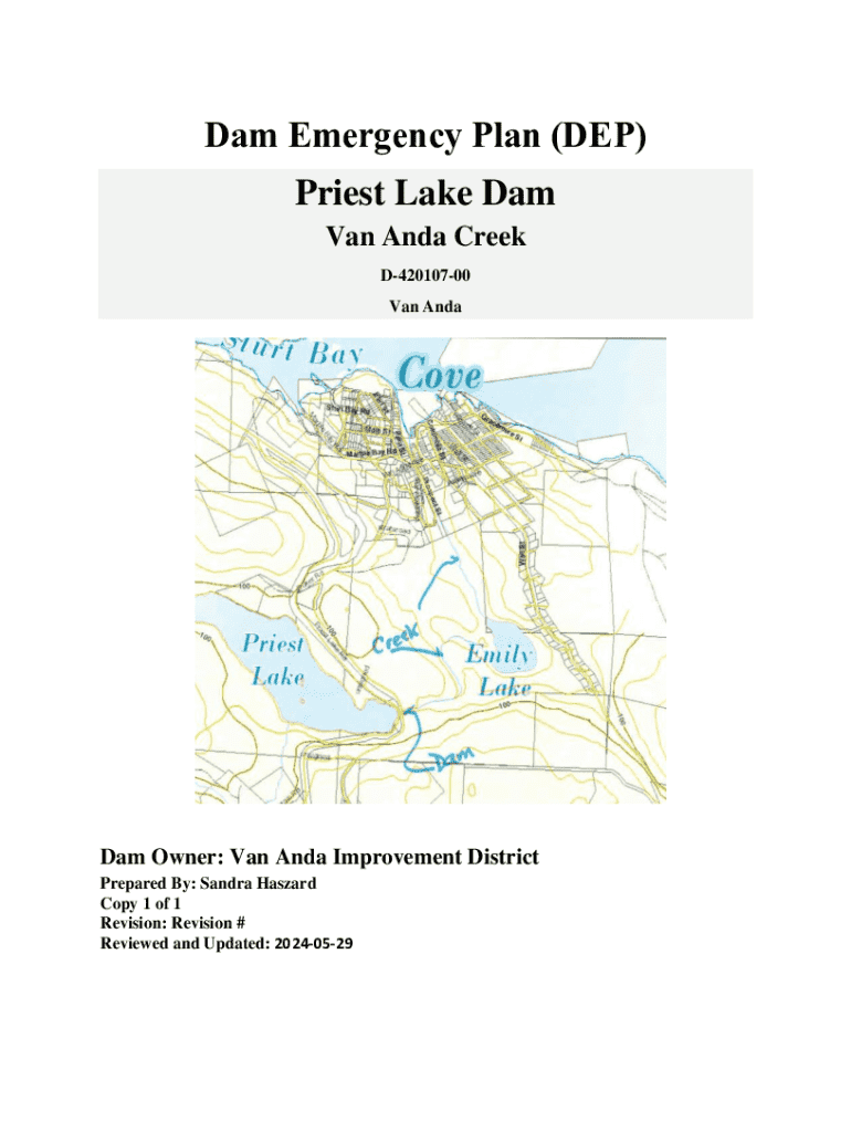 Dam Emergency Plan (DEP) Priest Lake Dam Van And Creek D42010700 Van Andaman Owner: Van And Improvement District Prepared By: Sandra Hazard Copy 1 of 1 Revision: Revision # Reviewed and Updated: 20240529Contents
