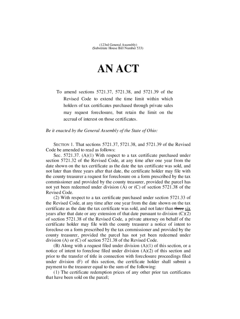 This bill amends Revised Code sections on the foreclosure process for tax certificates, extending request time limits and outlining payment requirements.