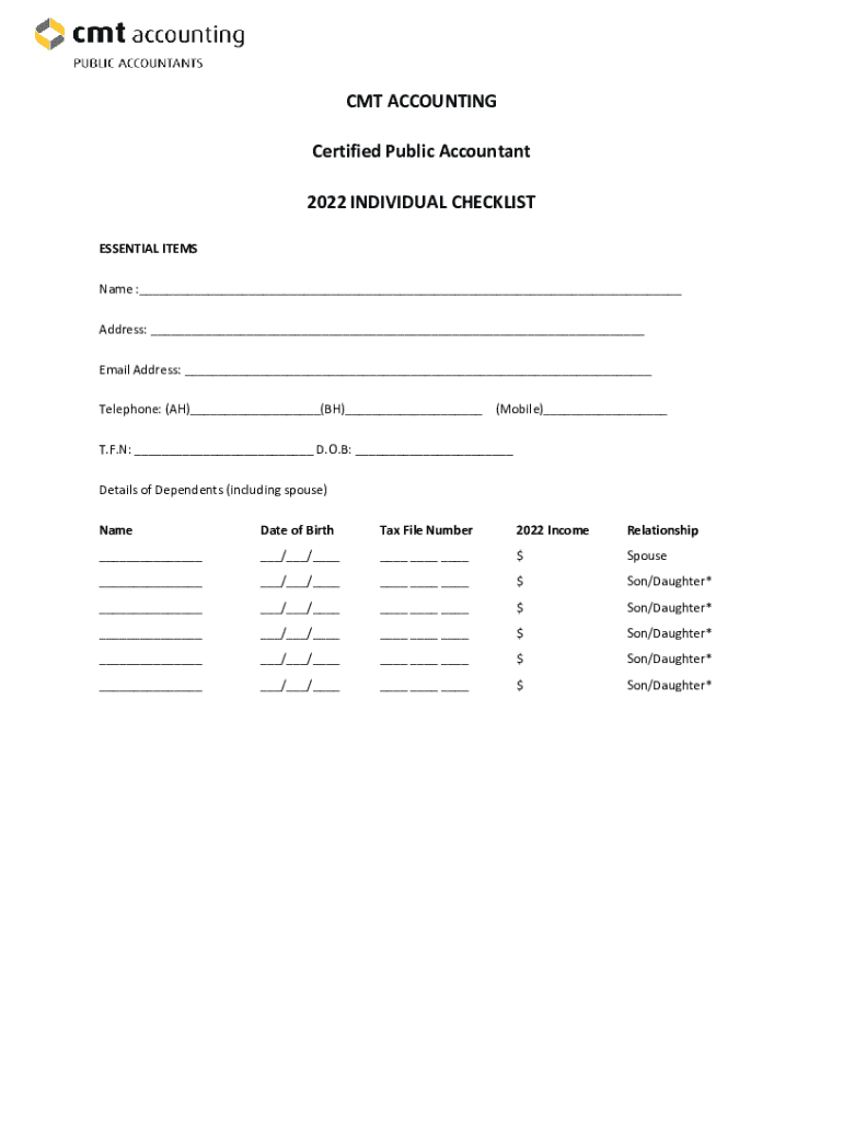 CMT ACCOUNTING Certified Public Accountant 2022 INDIVIDUAL CHECKLIST ESSENTIAL ITEMS Name :___ Address: ___ Email Address: ___ Telephone: (AH)___(BH)___ (Mobile)___ T.F.N: ___ D.O.B: ___ Details of