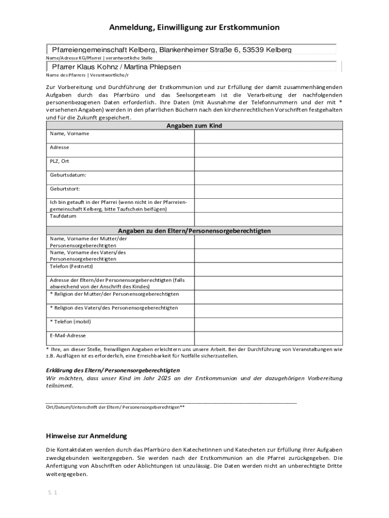 Die 'nameadresse kgpfarrei verantwortliche stelle' bezieht sich auf die zentrale Anlaufstelle, die für die Verwaltung und Übermittlung von Informationen zu bestimmten rechtlichen oder administrativen Anforderungen in einer Kirchlichen Gemeinschaft verantwortlich ist.