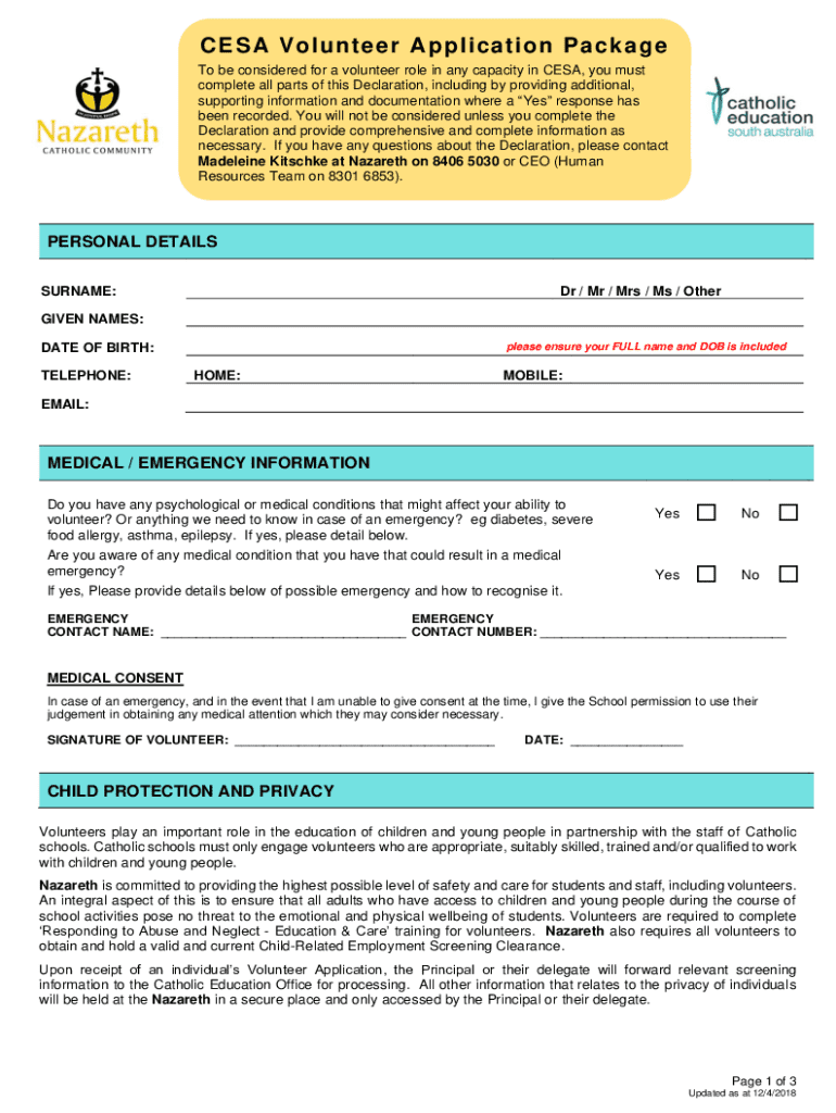 CESA Volunteer Application Package To be considered for a volunteer role in any capacity in CESA, you must complete all parts of this Declaration, including by providing additional, supporting information