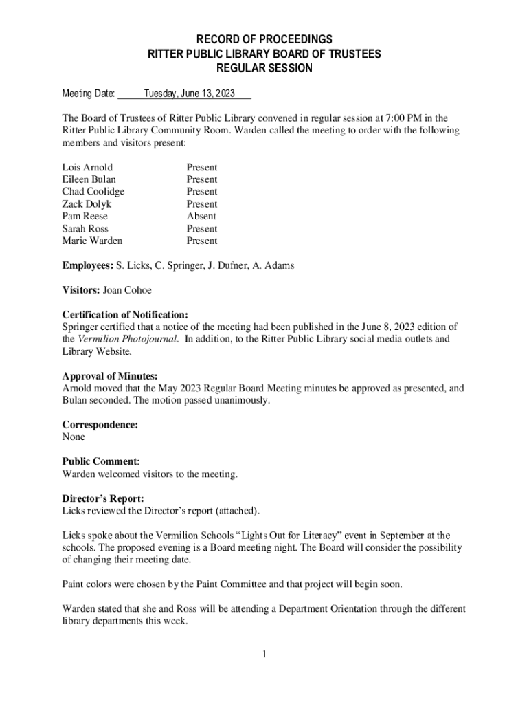 RECORD OF PROCEEDINGS RITTER PUBLIC LIBRARY BOARD OF TRUSTEES REGULAR SESSION Meeting Date:Tuesday, June 13, 2023The Board of Trustees of Ritter Public Library convened in regular session at 7:00