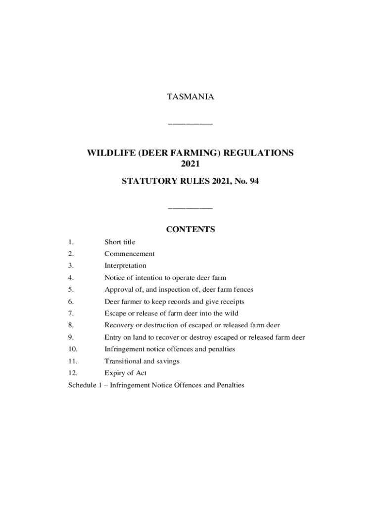 TASMANIA ___WILDLIFE (DEER FARMING) REGULATIONS 2021 STATUTORY RULES 2021, No. 94 ___ CONTENTS 1.Short title2.Commencement3.Interpretation4.Notice of intention to operate deer farm5.Approval of, and
