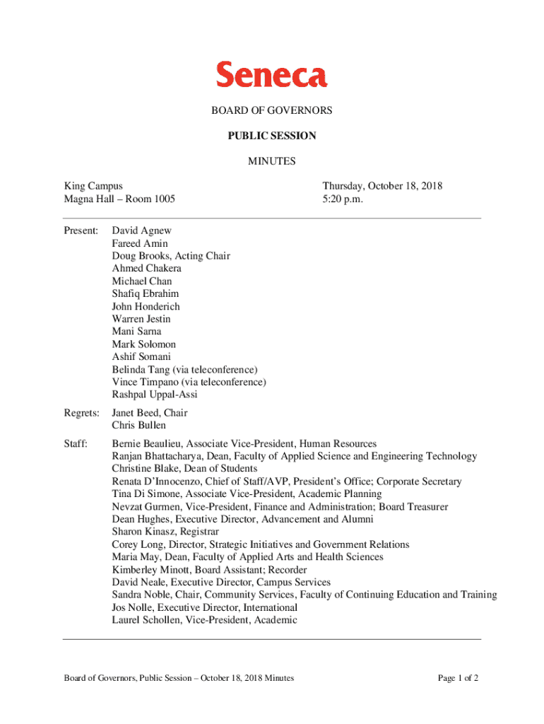 Minutes from the Board of Governors Public Session held on October 18, 2018, detailing attendance, consent agenda approvals, and key reports.
