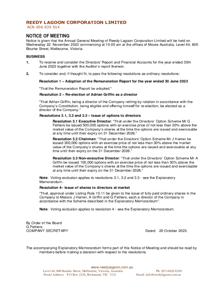 Join Reedy Lagoon Corporation\'s AGM on 22 November 2023 to discuss the Directors\' Report and vote on key resolutions including remuneration and director appointments.