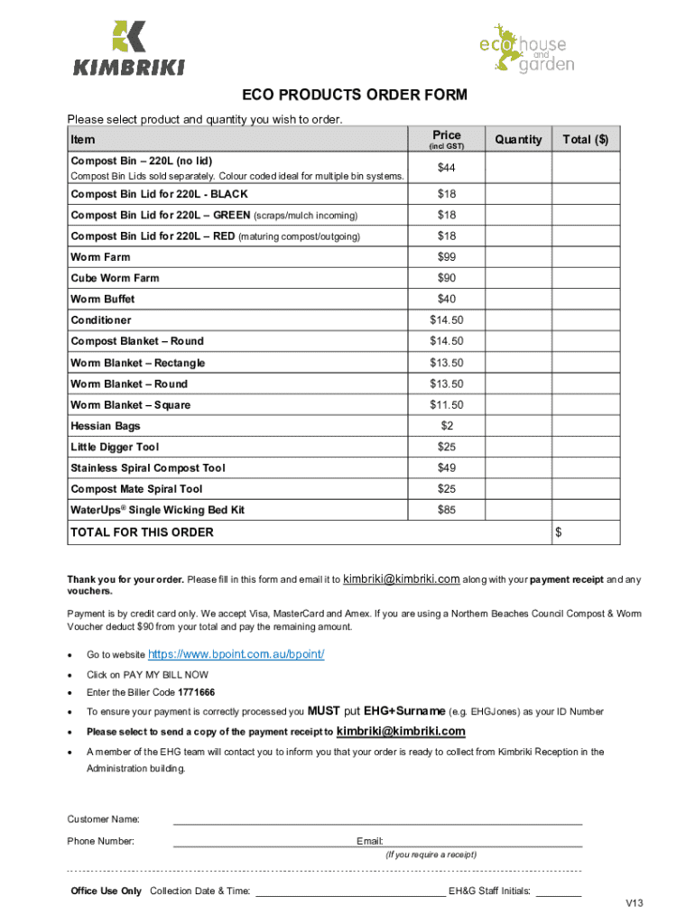 ECO PRODUCTS ORDER FORM Please select product and quantity you wish to order. PriceItem(incl GST)Compost Bin 220L (no lid) Compost Bin Lids sold separately. Colour coded ideal for multiple bin systems.QuantityTotal