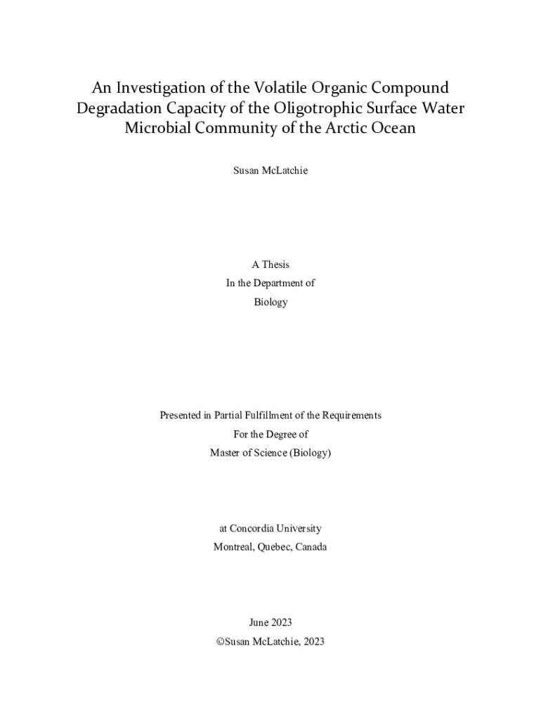 An Investigation of the Volatile Organic Compound Degradation Capacity of the Oligotrophic Surface Water Microbial Community of the Arctic Ocean Susan McLatchieA Thesis In the Department of BiologyPresented