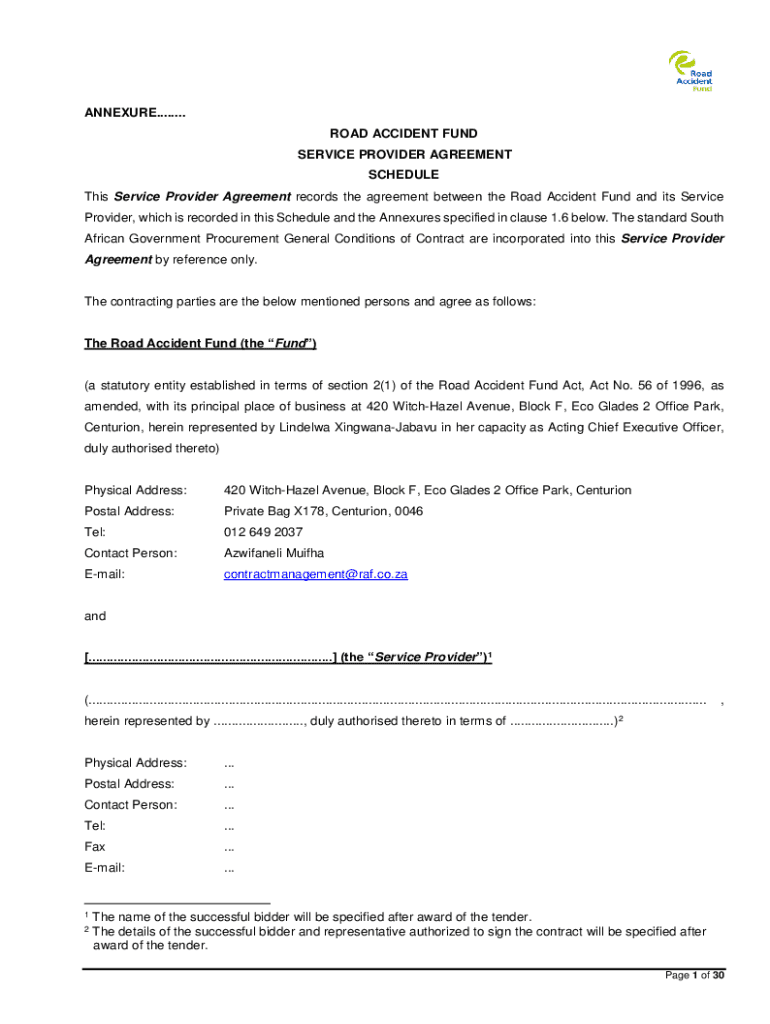 ANNEXURE........ ROAD ACCIDENT FUND SERVICE PROVIDER AGREEMENT SCHEDULE This Service Provider Agreement records the agreement between the Road Accident Fund and its Service Provider, which is recorded