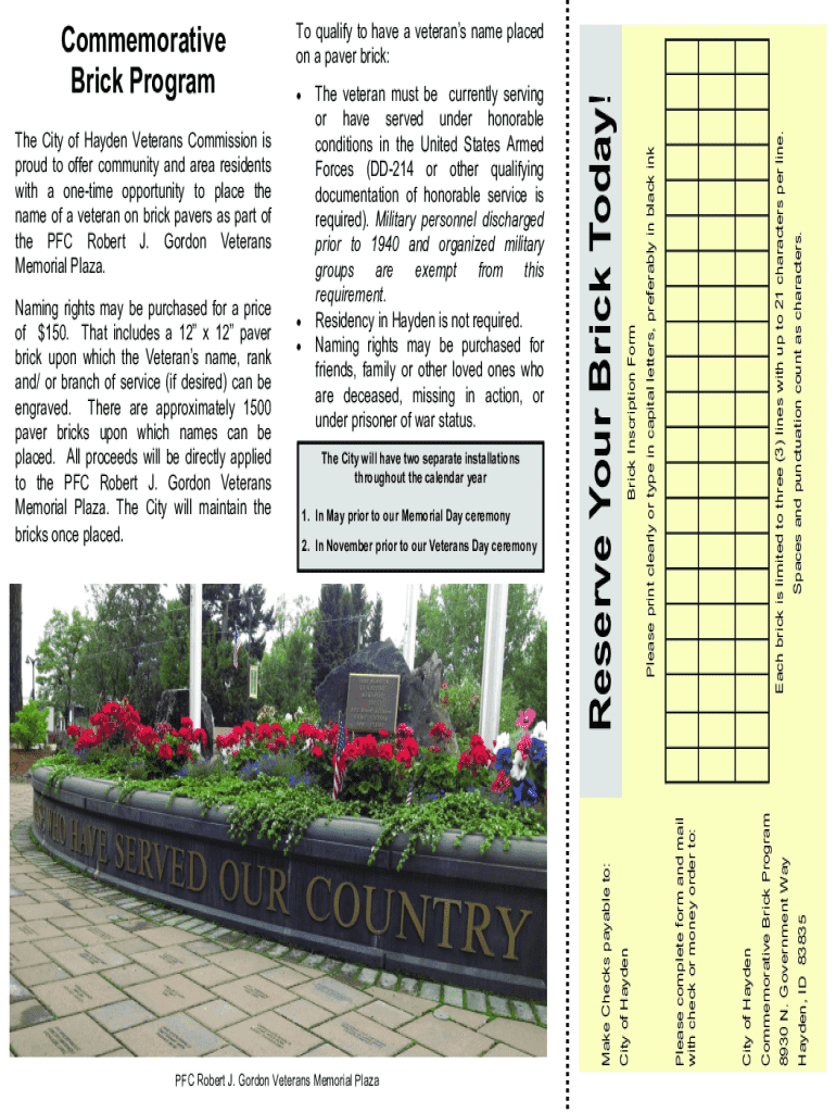 Join the Commemorative Brick Program to honor veterans at the PFC Robert J. Gordon Veterans Memorial Plaza. Reserve a brick for $150 today and participate in our upcoming ceremonies.