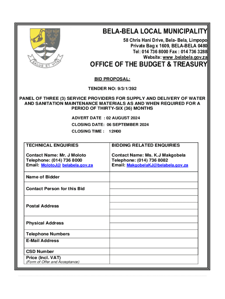 This document invites qualified service providers to submit bids for the supply and delivery of water and sanitation maintenance materials for Bela-Bela Municipality for a period of 36 months.