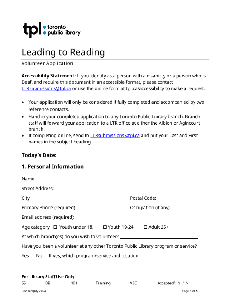 Apply to be a Leading to Reading volunteer at Toronto Public Library. Complete the application and provide references to make a difference in children\'s reading experiences.