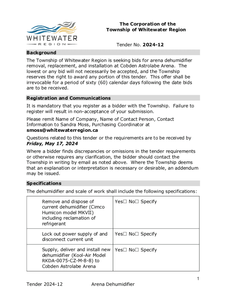 The Corporation of the Township of Whitewater Region Tender No. 202412 Background The Township of Whitewater Region is seeking bids for arena dehumidifier removal, replacement, and installation at