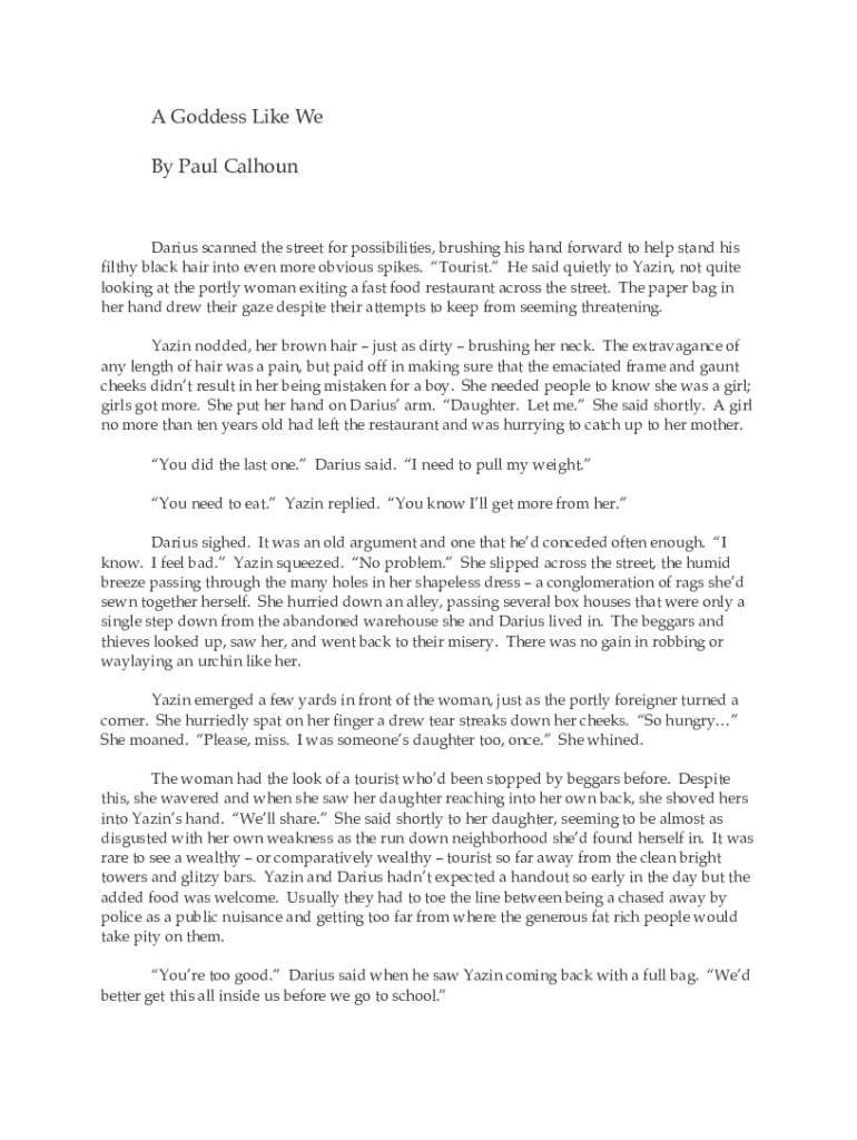 A Goddess Like We By Paul CalhounDarius scanned the street for possibilities, brushing his hand forward to help stand his filthy black hair into even more obvious spikes. Tourist. He said quietly